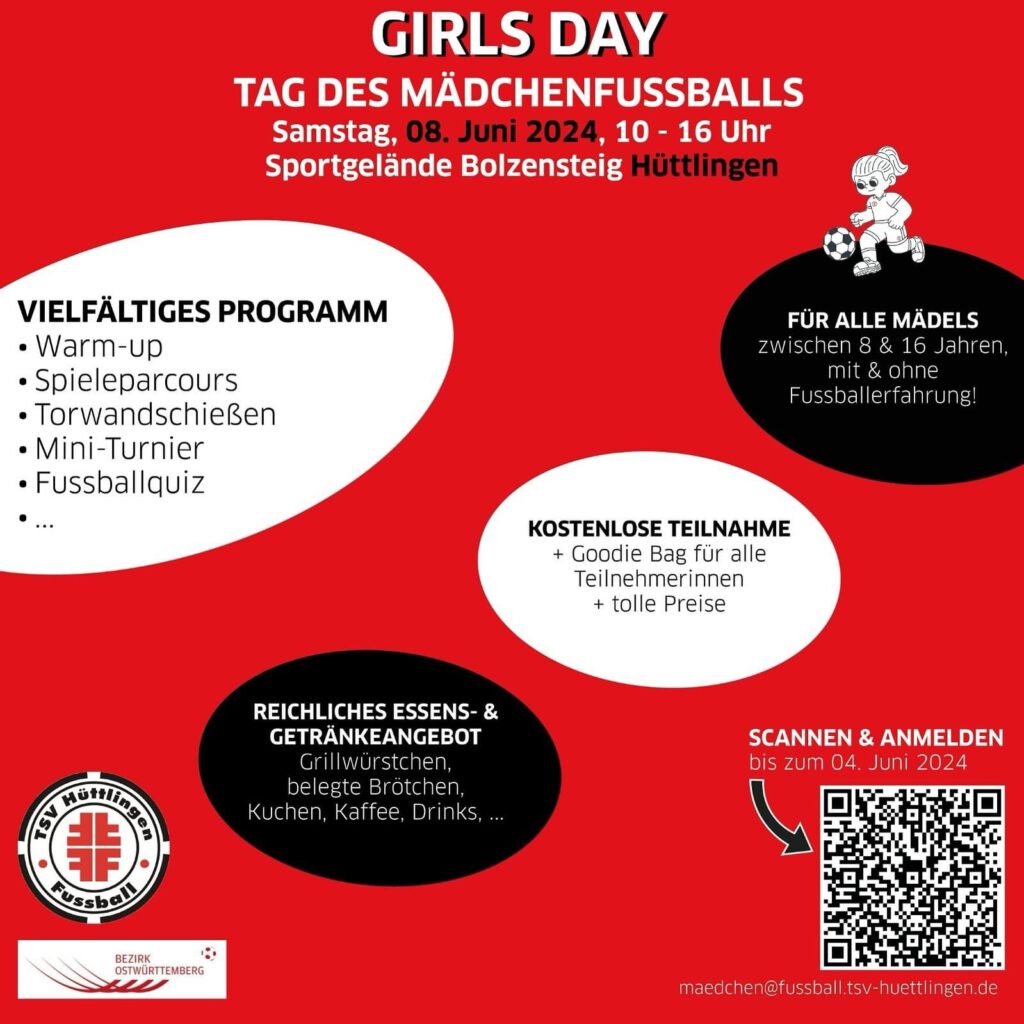 Dieses Jahr veranstaltet der TSV Hüttlingen am Samstag, 08. Juni 2024 einen Tag voller Fussball, Spiel & Spaß für alle fussballbegeisterten Mädels zwischen 8 & 16 Jahren! Mit einem tollen Programm, einer Goodie Bag für alle Teilnehmerinnen und vielfältigen Preisen! Zusätzlich wird für ein reichliches Angebot an Getränken und Speisen gesorgt. Auch die Familie oder Freunde kommen nicht zu kurz!